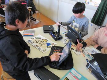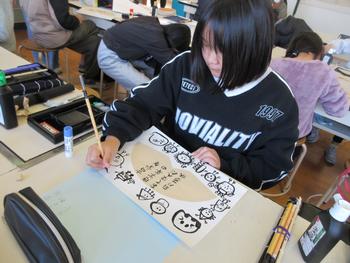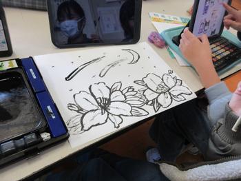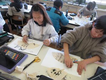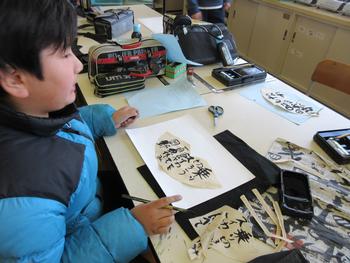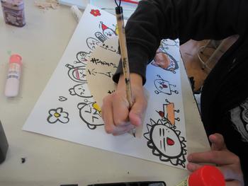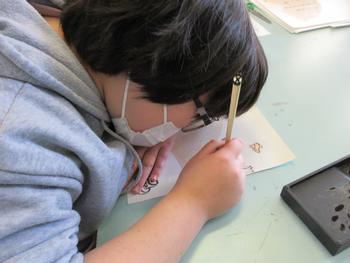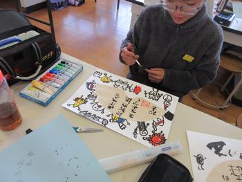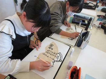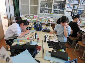 図工科では、コーヒーペーパーと筆を使って、