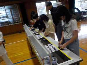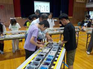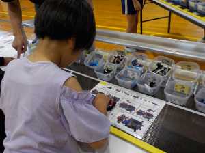 こちらは車の組み立て工程の体験です。レゴブロックの車を流れ作業で組み立てました。