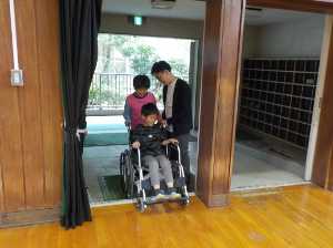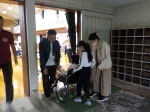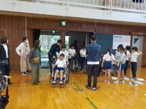 車いすの介助の方法や、視覚障害者へのサポートについて、親子で学びました。