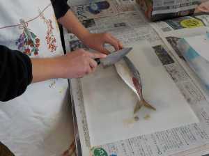 次は実際にウロコをとることから始め、アジを三枚におろしました。