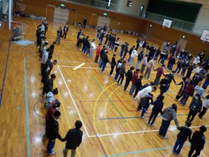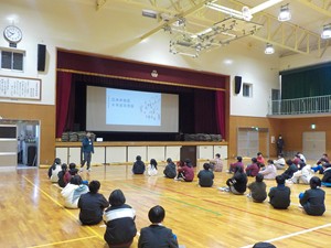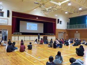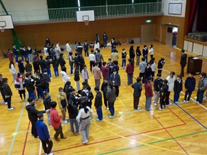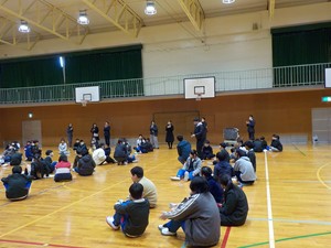 1月8日(木)AMに三木中学校校区の三樹小、平田小、口吉川小、豊地小の6年生が三木中学校体育館に集まり、交流会を行いました。