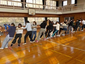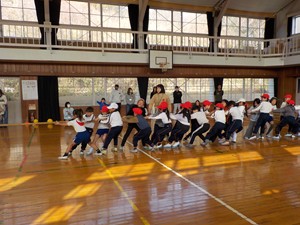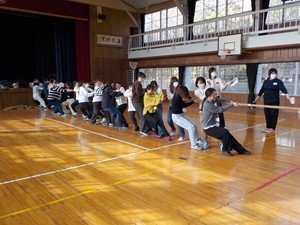 クラスで力を合わせて綱を引っ張りました。