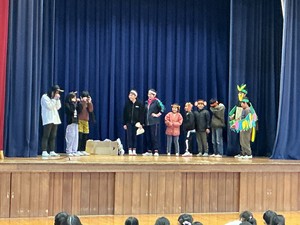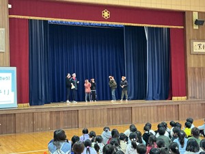 桃太郎をモチーフにした劇で、最後には桃太郎、連れの動物、鬼みんなが仲良くなるというお話でした。