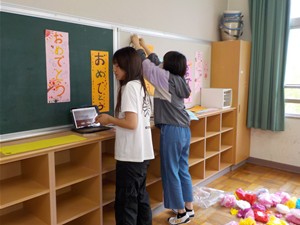 新6年生が登校し、掃除・体育館の入学式準備・1年教室の飾りつけ・机いすの移動等をしました。