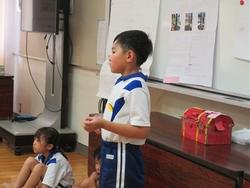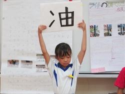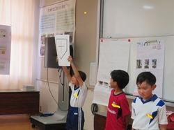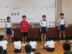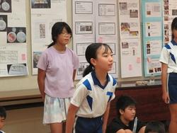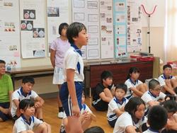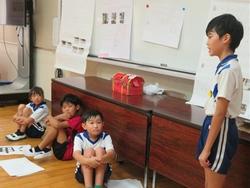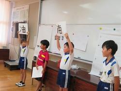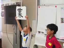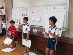 3年生は、国語で習った漢字についての間違い探しと、社会科で習った地図記号について、全校生に発表しました。