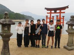 厳島神社の鳥居をバックに記念写真を撮りました。