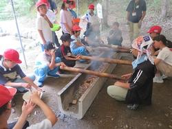 「自然学校の思い出」↓ バウムクーヘンつくりとカヌー体験