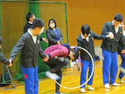 1列に並ぶことができたので、手をつないだまま、輪(フープ)の中を通ってつないでいくゲームをしました。