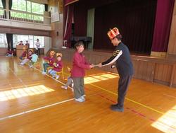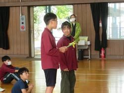 心を込めて作ったプレゼントを代表の人が1年生に渡しました。