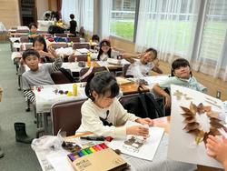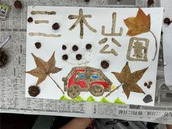 森林でひろってきた、葉っぱやドングリなどを使って作品をつくりました。