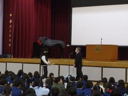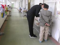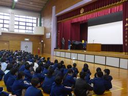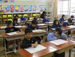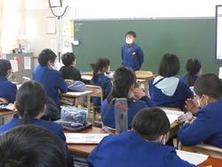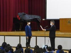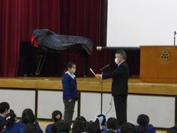 「2学期がんばったこと」を発表する1年生、6年生代表です