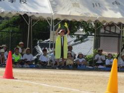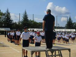 選手宣誓は小学校、中学校それぞれの代表が前に立ちますが、児童生徒代表あいさつや準備運動は小学校の代表が担当しています。
