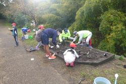 トライやるウィークで体験学習に来ている中学生と一緒に遊歩道の花壇に花を植えていきました。