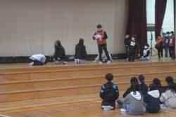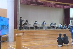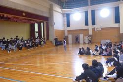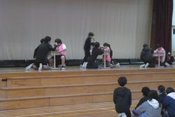 5年生から6年生への挑戦状。暗算や腕相撲など工夫を凝らした対決で場内は大盛り上がりを見せました。