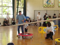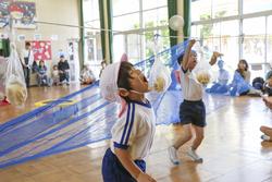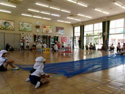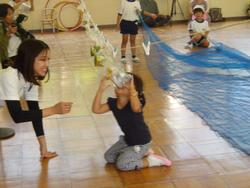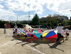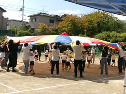 園庭での最後の種目は「バルーンあそび」今日は子どもたちだけでなくお家の人も参加してくださったのでこんな大きなバルーンの中に入って楽しむことが出来ましたね。風が強くてびっくりしましたが見事!大成功!嬉しいね。