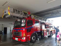 通報があると、ここで消防士さんが出動の準備をするのです。この大きなはしご車は市役所の屋上まで届く高さまで伸びるそう!