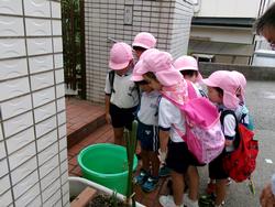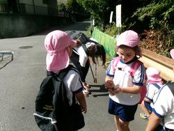 今日ももも組さんだけでお出かけです。途中のお家で「カエルが住んでいるんだよ!」とバケツの池を覗いて♪