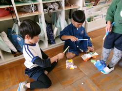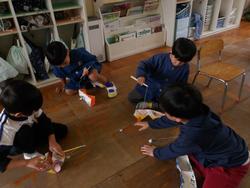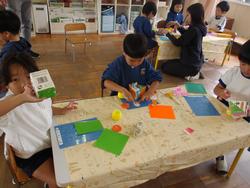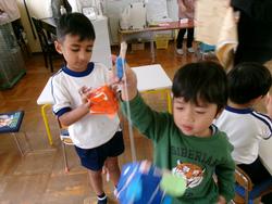 身近な牛乳パックを使ったおもちゃです。まずは牛乳パックをお魚に変身!糊と格闘しながら丁寧に貼り付け中です。