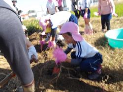 子どもたちはお芋ほりに夢中です。ツルが繋がってたくさんの芋が出てきてびっくり!