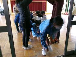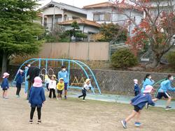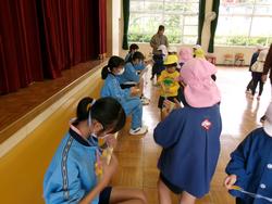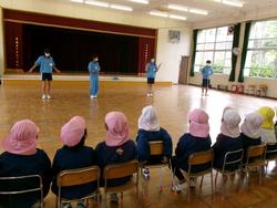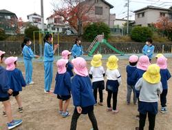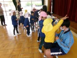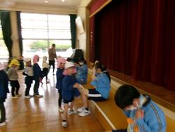 園庭中の色を探して大騒ぎ!!そして遊戯室では縄跳びを使って、「エレクトロン」を披露してくれました。今、縄跳びにチャレンジしている子どもたちは興味津々!