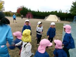 まず初めは「色鬼ごっこ♪」園庭中の色を探しています。