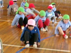 しりもちをついたまま逃げる増えオニです。遊びながら手と足を鍛えるこの鬼ごっこ、逃げる方も追いかける方も必死です♪