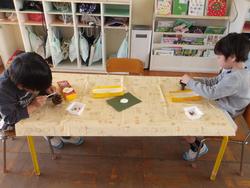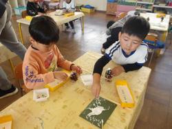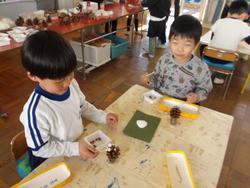みんな真剣!そしてもう一つの松ぼっくりには白い毛糸を巻きつけていきます。この松ぼっくりには足に見立てた木の棒も付いてるよ。