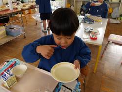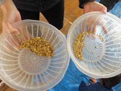 かわいい大豆が出来ていましたよ!「緑色からお豆の色になってる!」早速塩バターで蒸し炒めをして味見です。