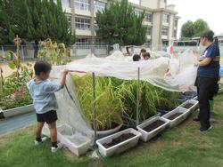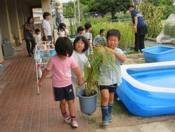 手前のたらいとバケツの列に植わっているのが、子どもたちが芽出しから育てた、こめちゃん・うえちゃんです。