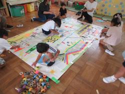 初めは、一人一人が好きなもの、作りたいものをマスキングテープで形作っていましたが、