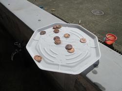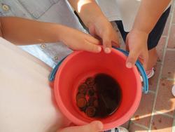 先生は、10円玉を小さなバケツの中に入れ、そこにケチャップと水を少し入れました。