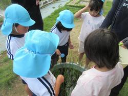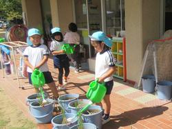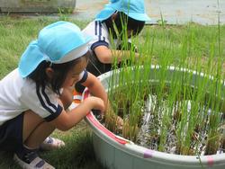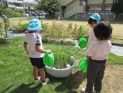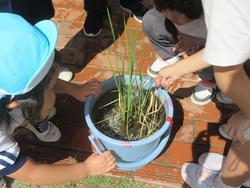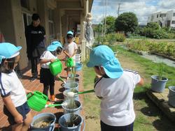 子どもたちは、芽が出ているバケツのこめちゃん・うえちゃんも育てることにしました。