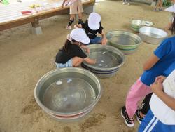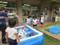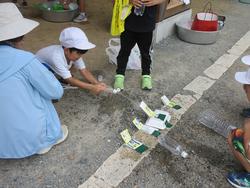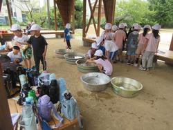 1年生の生活科の授業では、グループに分かれて水を使ったやってみたい遊びを発展させる取組を見せていただきました。