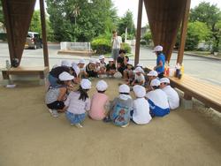 先生が容赦なく(^^;)ホースで雨を降らせますが、子どもたちは昨年度の年長さんの様子を見ていて、既に想定済!!