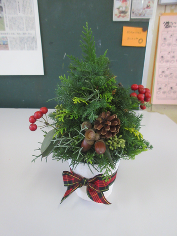 12月ということで、クリスマスツリーのアレンジメントを制作しましたよ!