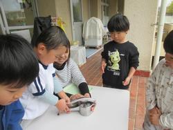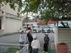 この日、業間交流に来た1年生の数人が、幼稚園のザクロの木に実がなっているのに気がつきました。
