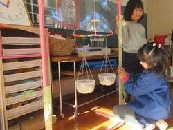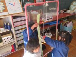 「同じ重さになったかな・・・?」子どもたちが釣り合いを確かめようとしますが・・・