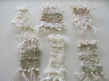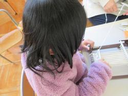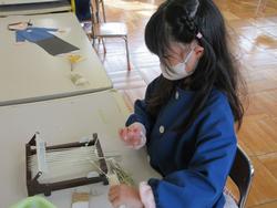 そこで、市販の機織りキットを使って、縦糸に凧糸、横糸に幼稚園で紡いだ綿で機織りをしました。