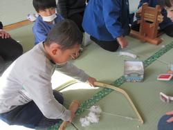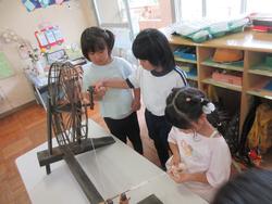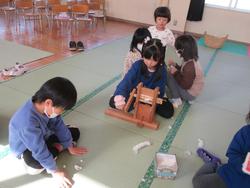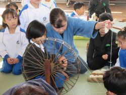 初めは、手加減が難しいので、先生が糸の束を引き、子どもたちが糸車を回す役割をしていましたが、