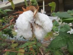 やがて芽が出た綿は、花壇の田んぼの隣の花壇に植え替え、秋になって田んぼの稲の横で無事綿の実を実らせました。