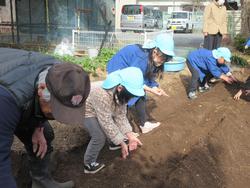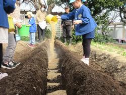 もみ殻や肥料といっしょにじゃがいもの種を畑の畝深くに植えました。