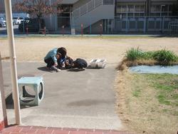 2分ぐらいして、怪我役の先生が担がれて避難場所に戻ってきました。