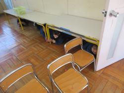 年長さんのクラスにはその時先生がいませんでしたが、自分たちで考えて机の下に避難していました。すごいです!