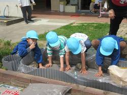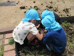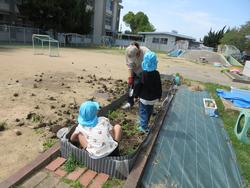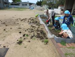 今年も園庭花壇とバケツが子どもたちのお米の田んぼ場所です。