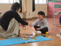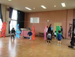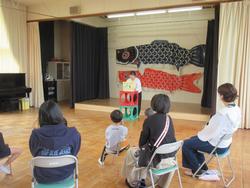 こいのぼりの紙芝居を見た後、カラーポリ袋を使って、大きなこいのぼりを作りました!