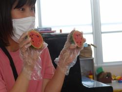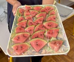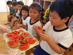 鷹にろくろ首、マネキンのかかし、パンチマシーンなどなど…いろんなかかしでカラス対策していた4・5歳児の子どもたち。カラスから守り切り何個か実っていたスイカをとうとう収穫し、食べることになりました!スイカを切ってみると、こんなにおいしそうな色に…。先に4歳児のスイカが色づいたので、「いつもお世話してくれるから…」と5歳児さんにおすそ分け。