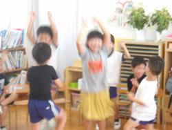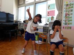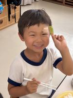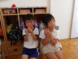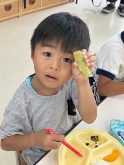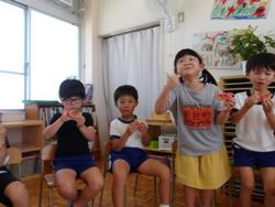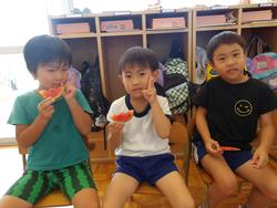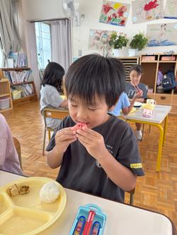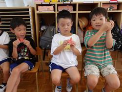 5歳児も貴重なスイカができました。かかしだけでなく、「ざる、かぶせて守ろう!」と何重にも守っていたスイカ。とってもかわいいサイズでしたが、切ってみると真っ赤に熟れておいしそう!!切った瞬間みんな大喜び!!\(^o^)/写真がぶれるくらい、喜んでいました。すごいです!!