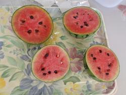 苦労の末にできたスイカ。みんな大事に大事に食べて、皮すれすれまできれいに食べるのでした。