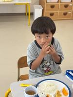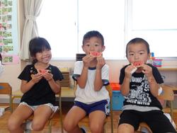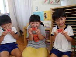 ぱくっ!大事にひと口目を味わった子どもたちも「あま~~~~い!!」「最っ高~~~~!!」表情に全身に喜びを表しつつスイカを食べたのでした (^▽^)/ カラスとの知恵比べ?戦い?だったスイカの栽培。なんとか4歳児も5歳児も食べることができました。本当にみんなよかったね!!