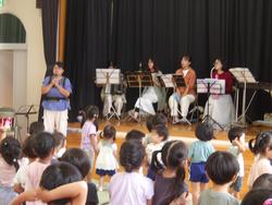 今月の誕生会のゲストは『女子十七楽坊』のみなさん。大人にはちょっと懐かしいリコーダーや鍵盤ハーモニカ、子どもたちも知っている鉄琴やクラリネットなどを使って楽しい演奏会をしてくださいました。未就園児の会「てくてく広場」のみなさんも一緒に楽しい音楽を聴いて、体をゆらしてリズムにのったり、歌ったりして一緒に楽しむことができました。音楽の生演奏鑑賞やみんなで歌うことが、ママたちのリフレッシュや子育てパワーになれば…と思います。